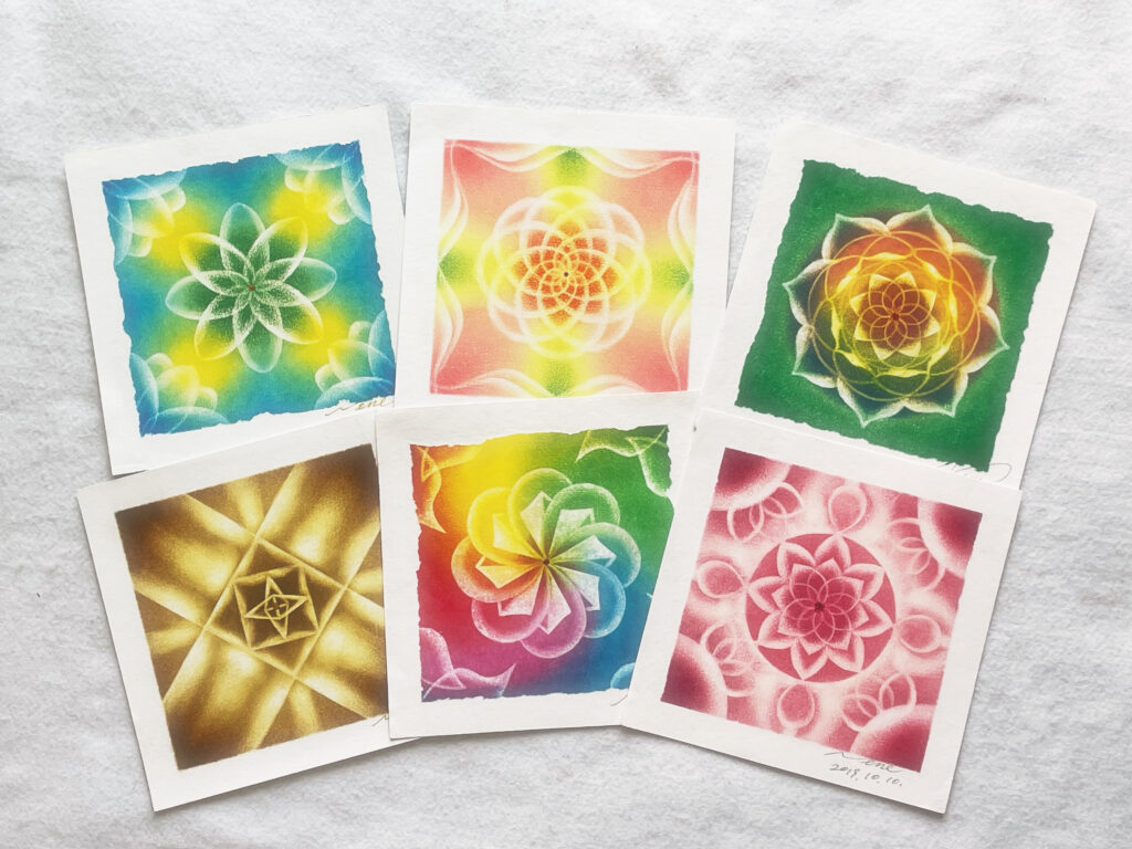 誰にでも親しみが持てやすいパステルの優しい色味。そんなパステルを粉状にして、指でくるくる紙に描く…。曼荼羅アート(『曼荼羅ワーク®』の手法)や、和(NAGOMI)アートほか手法を活かしたパステルという画材を使って描くアート。『わたしにも描けた!』から、心を広げ、みえる世界を見渡して。